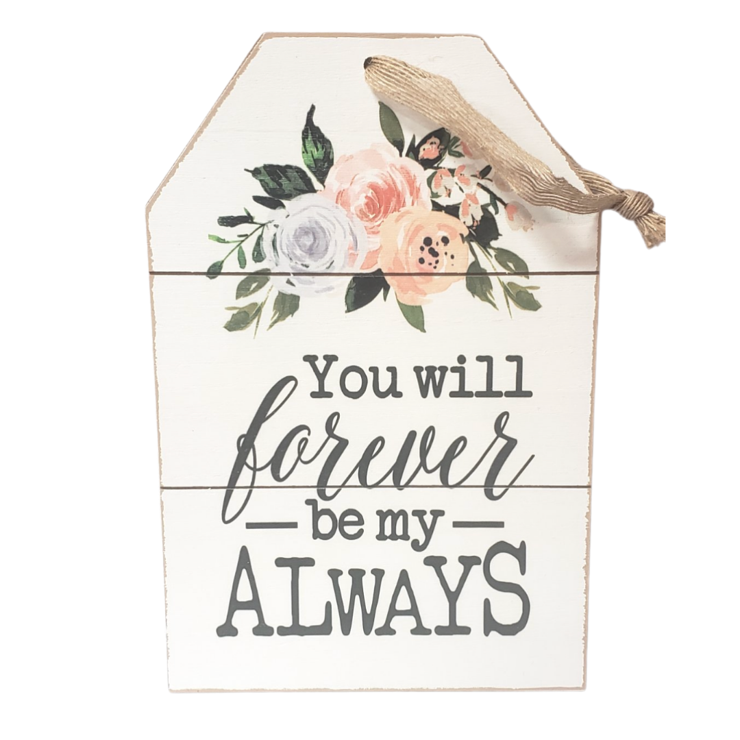 Whether as a gift for a cherished person or as a meaningful addition to your own space, the Forever & Always Wooden Hanging Sign with flower design embodies a sense of everlasting love and connection. Its delicate floral details and heartfelt message make it a wonderful symbol of the bond that remains unbreakable – forever and always.