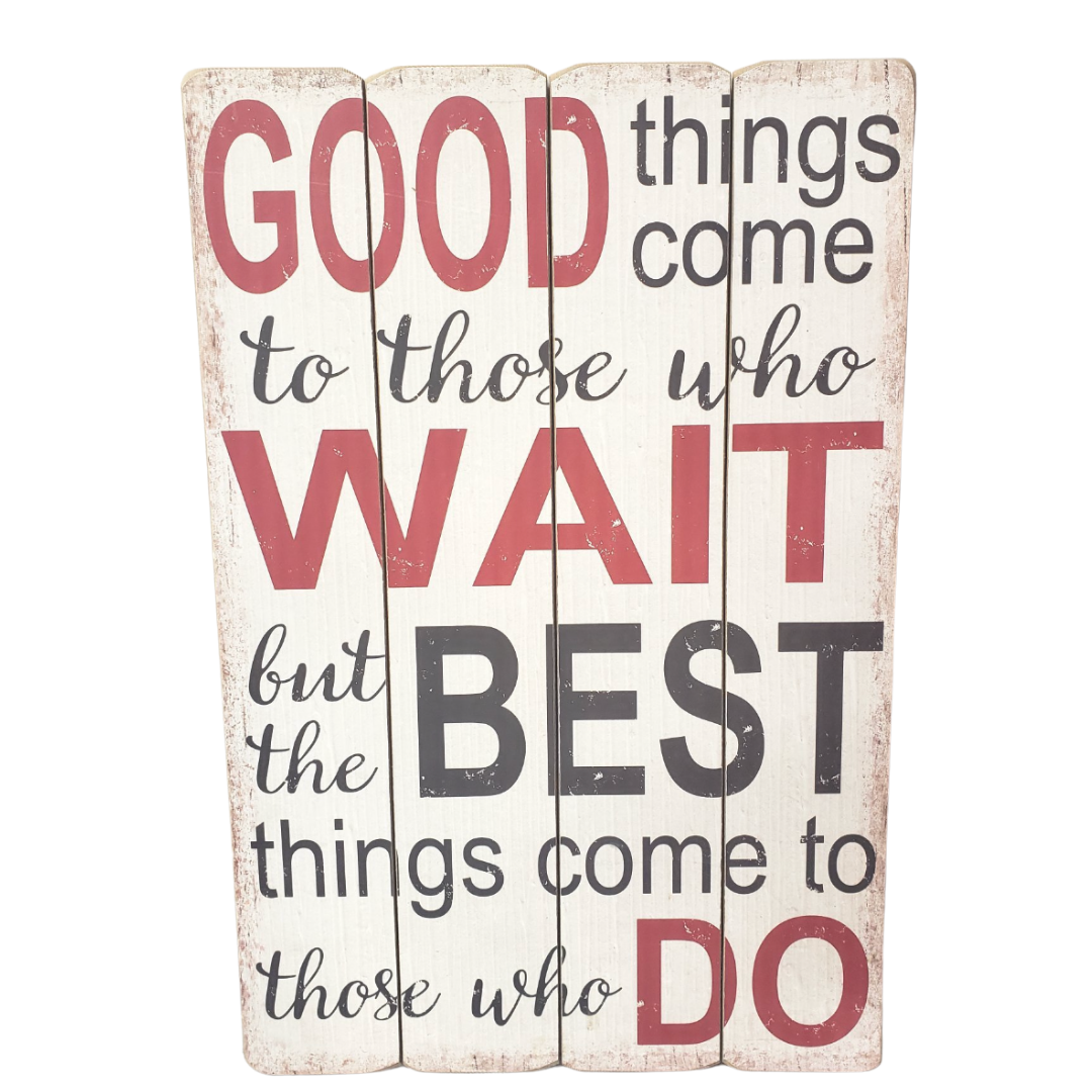 "Infuse your space with inspiration using our wooden slat sign: 'Good Things Come to Those Who Wait, The Best Things Come to Those Who Do.' This rustic piece serves as a daily reminder that patience and action are the keys to unlocking life's greatest rewards. Hang it proudly as a testament to your determination and perseverance, and let its timeless message motivate you to chase your dreams. With its vintage charm and powerful sentiment, this sign is the perfect addition to your decor. Embrace the wisdom it imparts – get your wooden slat sign today and transform your space into a haven of aspiration and achievement."