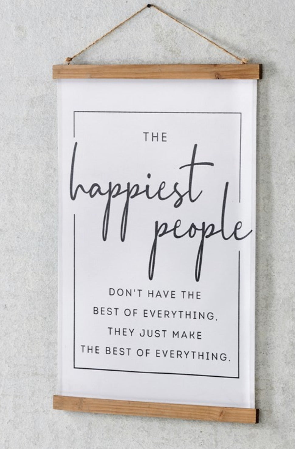 Introducing our "Happiest People" Sentiment Fabric Wall Hanging – a heartwarming addition to your living space! The soft and durable fabric adds a touch of warmth to your home, while the sentiment serves as a daily reminder to cherish life's joyful moments. With easy hanging, it's effortless to adorn your walls with positivity and charm. Elevate your décor and uplift your spirits with the "Happiest People" Sentiment Fabric Wall Hanging – a simple yet powerful statement for your home.