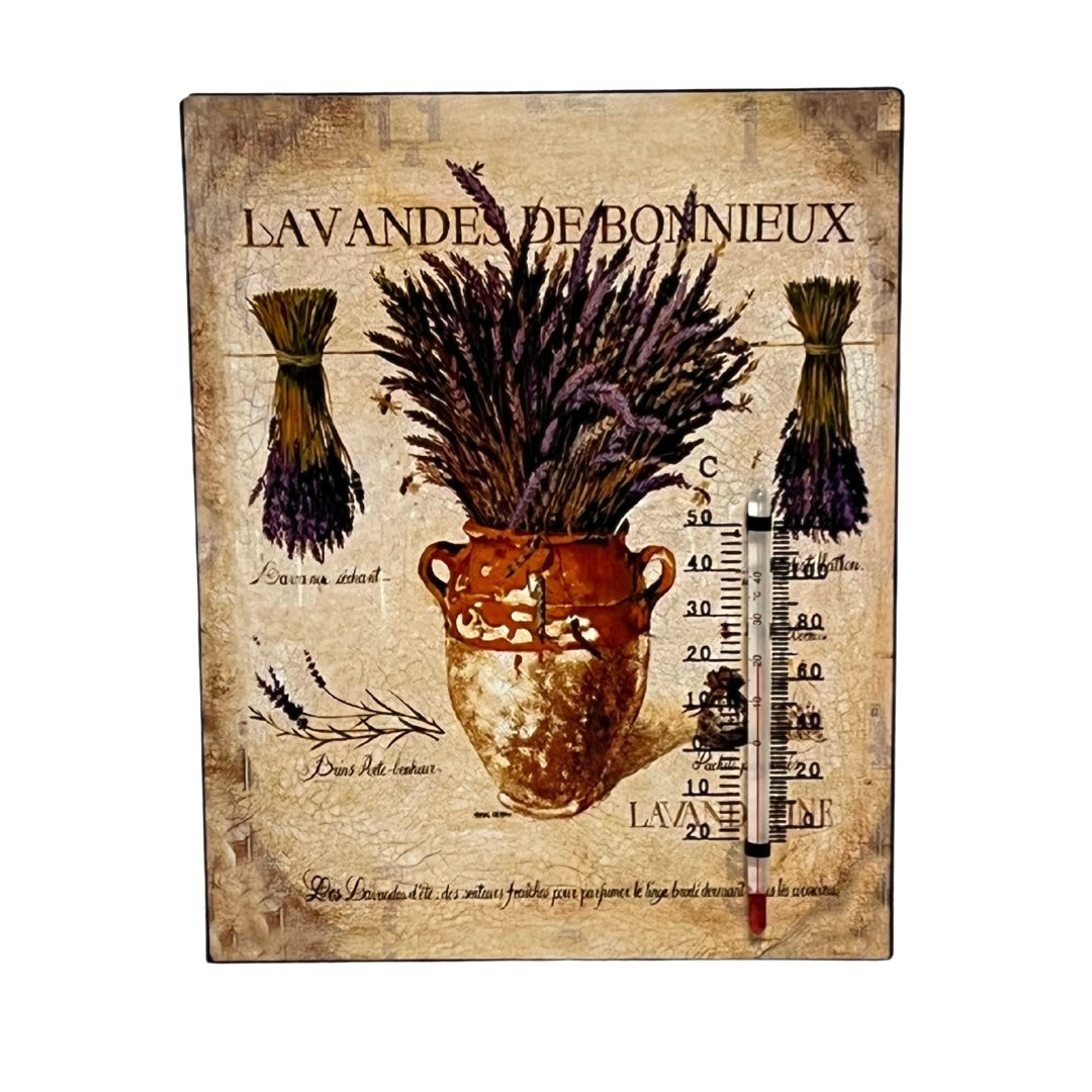 Elevate your decor and stay informed about the temperature with the Lavandes De Bonnieux Tin Sign with Thermometer. Embrace the allure of Provence in your home or garden. Order yours today and let the beauty of lavender bloom year-round!