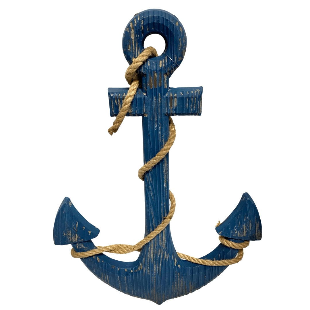 Enhance your coastal decor with this stunning wooden anchor, elegantly adorned with a navy blue finish and expertly wrapped with authentic rope. The intricate details and rich color make it a standout piece, perfect for bringing the charm of the sea to your living space.