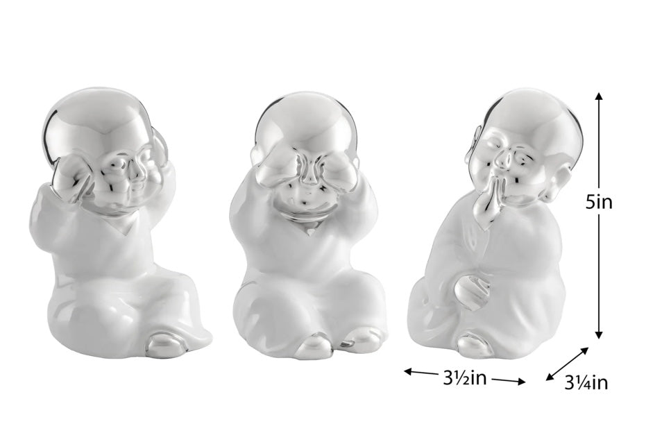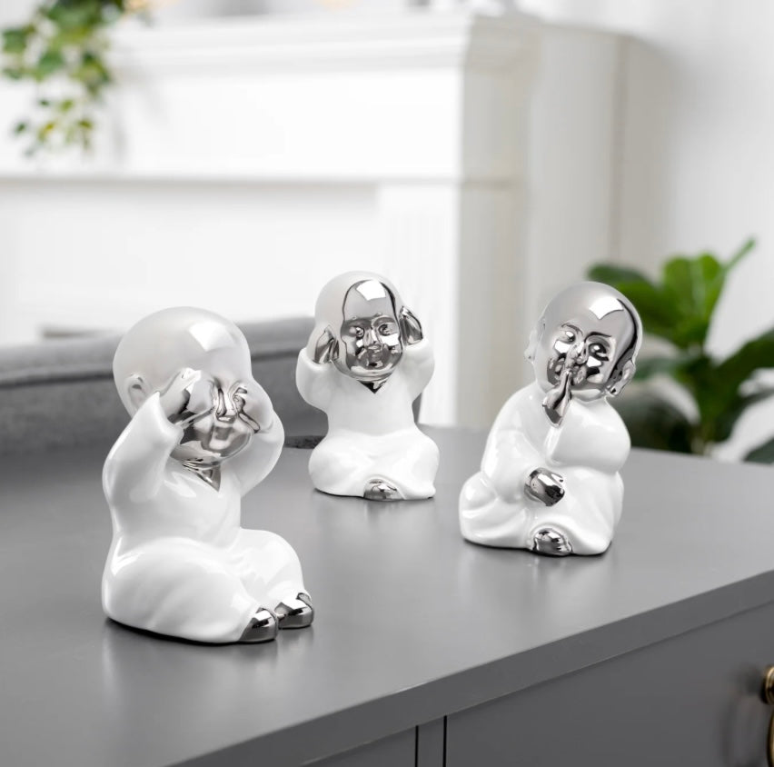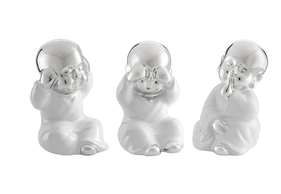See Hear Speak No Evil 3 Piece Ceramic Wise Buddha Babies Set - Silver