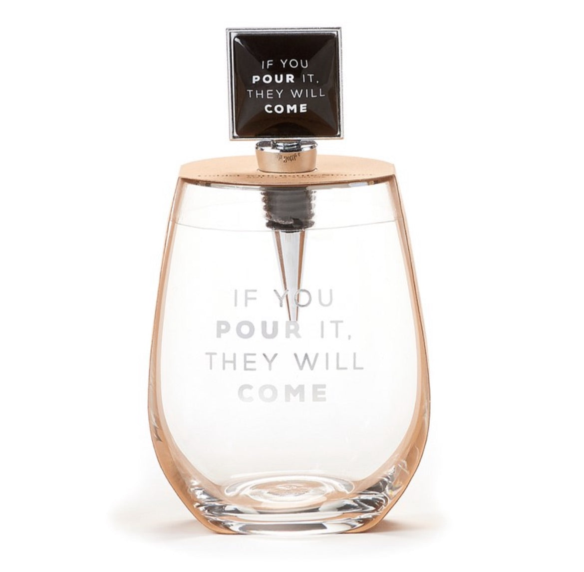 These stemless wine glasses with bottle stoppers are packaged beautifully for gift giving. Clear glass stemless wine glasses and gold/silver tone and black bottle stopper with quote. FDA approved. Hand wash recommended. Zinc Aloy, Rubber, Glass.